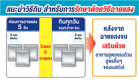 แนะนำกิน 3 ซองต่อวัน 5 วันก่อนการฉายแสง และกิน 3 ซองต่อวัน ทุกวันจนจบการฉายแสง